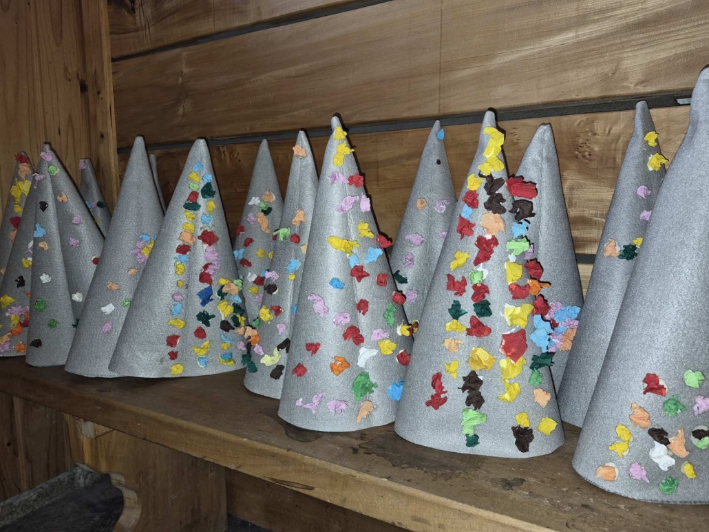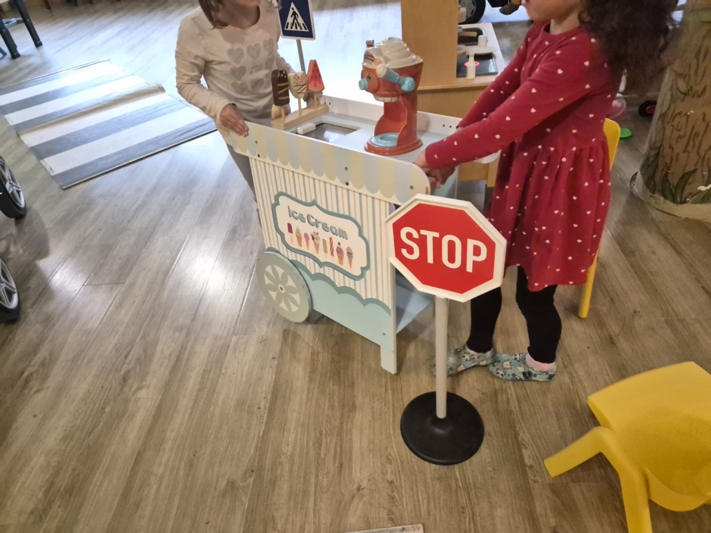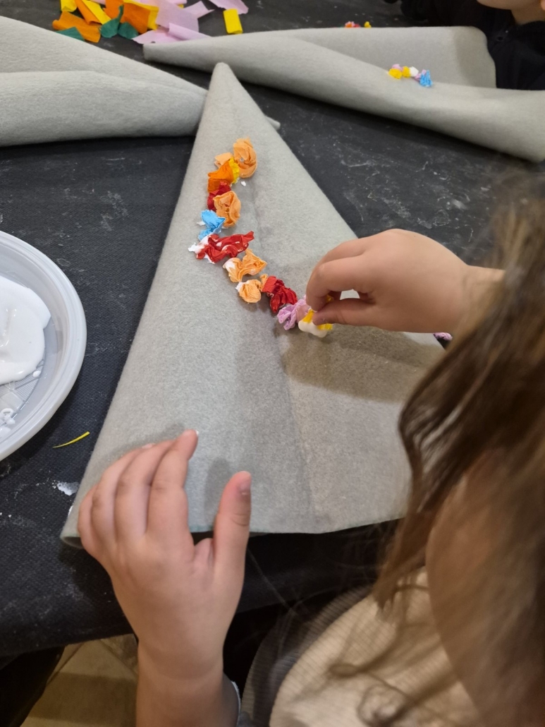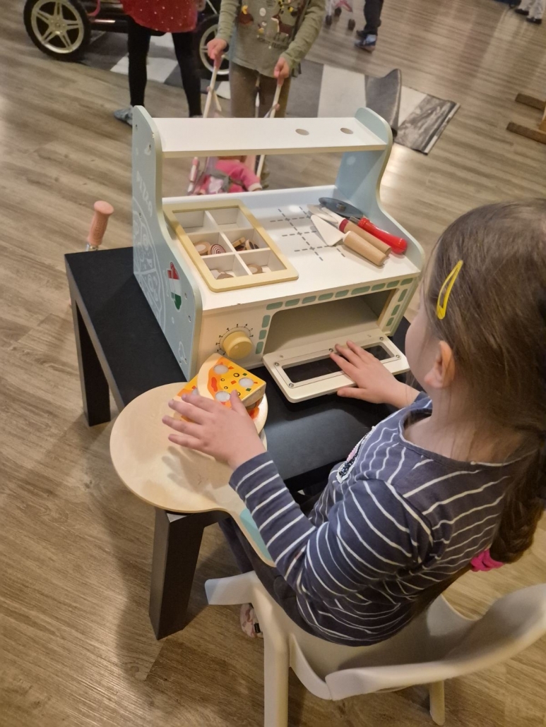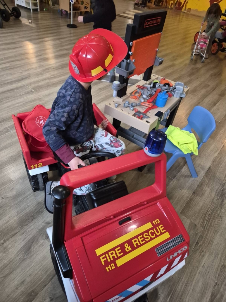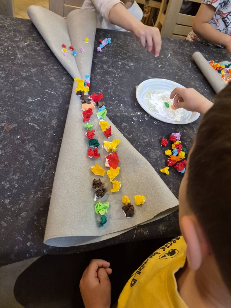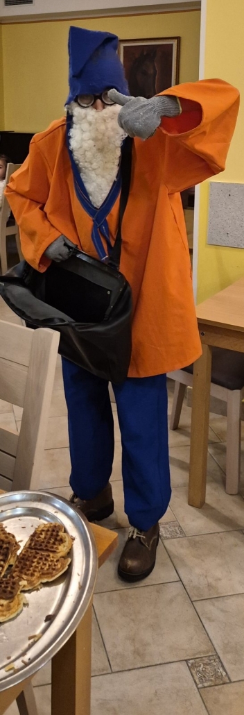 A vesta, da smo zjutraj, ko smo se zbudili, dobili presenečenje v copate! Potem nas je obiskal škrat Poštarček in nam prinesel pismo. Naredili smo si prave škratove kape in se igrali na ful dobrem poligonu. Vozili smo avtomobile, pa skiroje in se hecal, da smo policisti, pa gasilci. Za hec smo lahko tankal’, pa popravljal’ avto, pekl’ pice, delal’ sladoled, pa piškote. Tud’ plesal smo, vsi skupi. Komaj čakamo na zabavo po počitku…